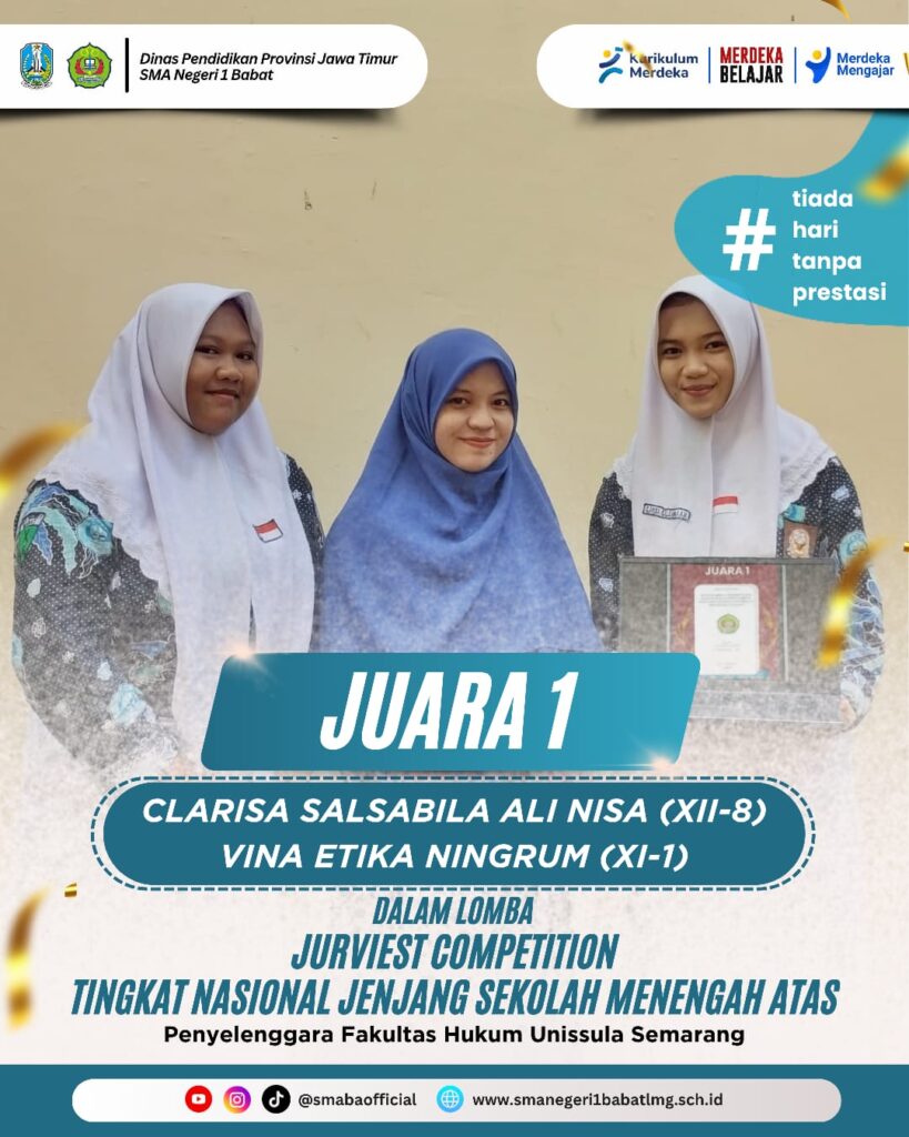 Hallo sobat jussmaba!! kembali lagi nih sama minjuss pada edisi Juss-Spiring. Kali ini minjuss mau ngajak sobat jussmaba buat kepoin prestasi apa saja sih yang diperoleh siswa-siswi SMA Negeri 1 Babat. Sesuai dengan Tag Line SMA Negeri 1 Babat yakni “Tiada Hari Tanpa Prestasi”. Pada edisi kali ini minjuss mau ngajak sobat jussmaba untuk kenalan ini sama the Winner kali ini yakni Clarissa Salsabila Alinisa dari kelas XII-8 yang akrab disapa dengan Kak Alin dan Vina Etika Ningrum yang akrab disapa dengan Kak Vina dari kelas XI-1.